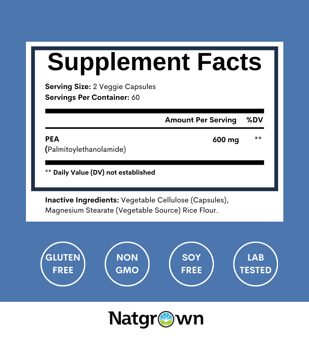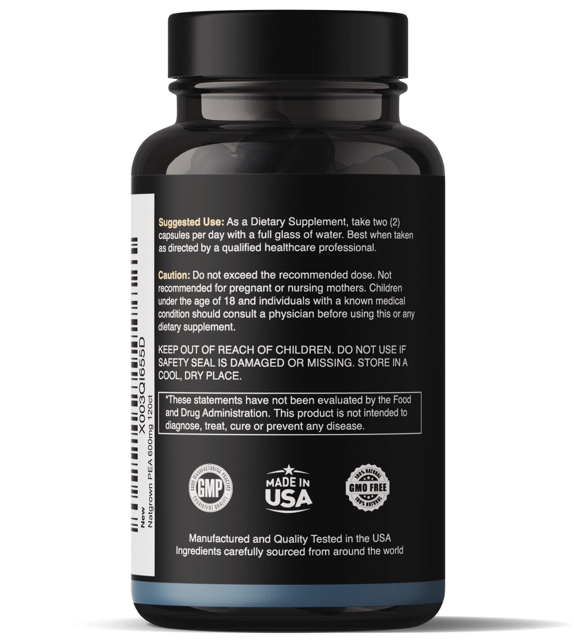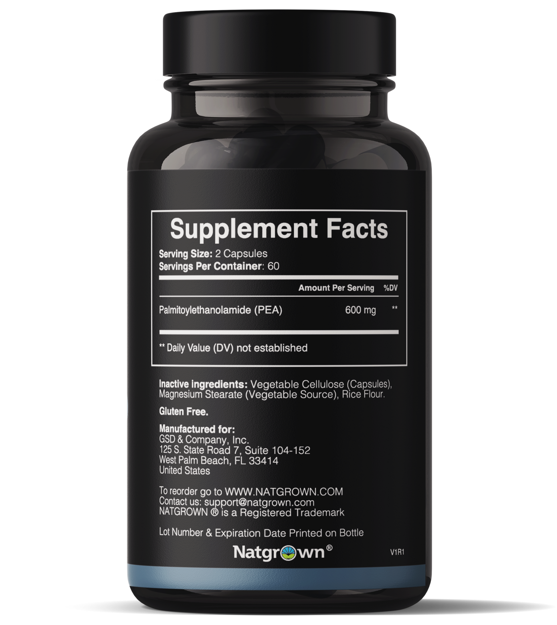 PEA (Palmitoylethanolamide) is a compound naturally produced by your body. Studies for Palmitoylethanolamide (PEA) have shown that when taken every day for three weeks, PEA significantly supported comfort levels for 636 participants. Our formula contains 600 mg per serving same as the clinical study.